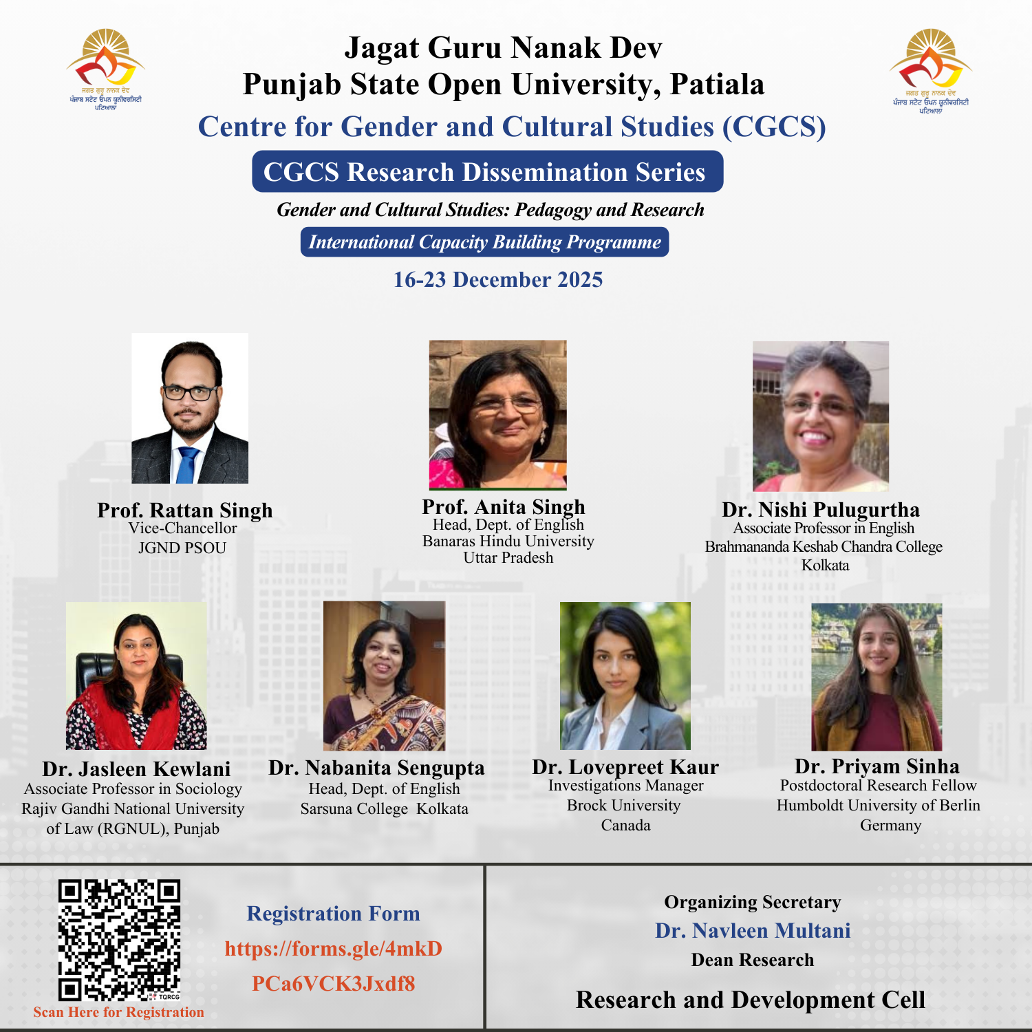 Jagat Guru Nanak Dev Punjab State Open University, Patiala has been established by the State Legislature Act No. 19 of 2019 as the first Open University in the state of Punjab. The University endeavour to open new vistas for the education and employment seekers through its extensive network of Learner Support Centre. JGND PSOU believes in providing education for all and has been extending its outreach to learners in jail, rural/ remote areas, PwD, SC/ST Learners. JGND PSOU has implemented many recommendations of National Education Policy (NEP) of Government of India by focusing on learner-centred approach to teaching and learning and promoting online and digital mode of programme delivery. University is moving ahead in introducing various UG/PG and new skill based courses. The University is a multidisciplinary university with full-time faculty in its six school of learning. University aims to provide high quality, innovative, accessible and need-based programmes to all those who aspire to attain higher education.